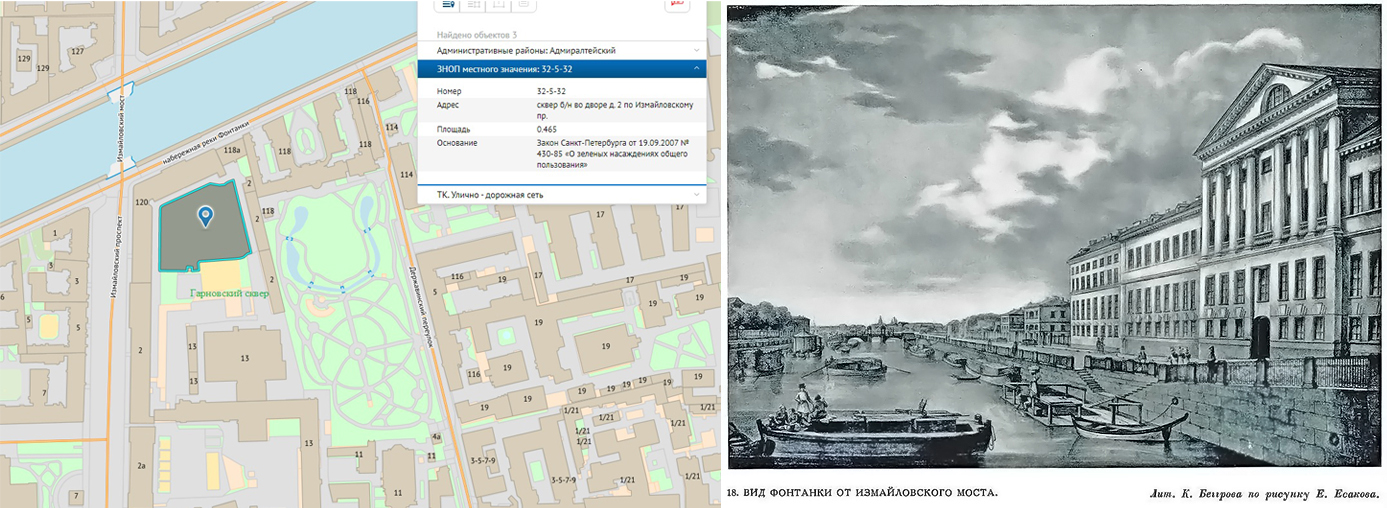 Гарновский сквер, расположившийся во дворе дома № 120 по набережной реки Фонтанки, получил название в память о Гарновских казармах лейб-гвардии Измайловского полка, которые занимали также смежный дом № 2 по Измайловскому проспекту. Это название закрепилось в народе по фамилии Михаила Гарновского, бывшего владельца огромного дома на Фонтанке, который и был перестроен для казарм в начале XIX в. по проекту Луиджи Руска. Современный Советский переулок, выходящий к кварталу казарм с юга, с начала XIX в. до 1921 г. носил название Гарновская улица или Гарновский переулок.