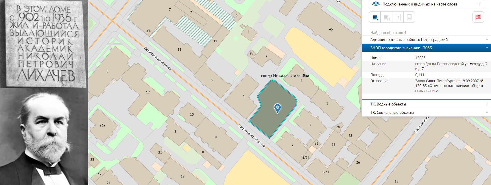 Два сквера на Петроградской стороне также получили имена выдающихся культурных деятелей. На Петрозаводской улице, между домами № 3 и № 7, расположился сквер Николая Лихачёва.