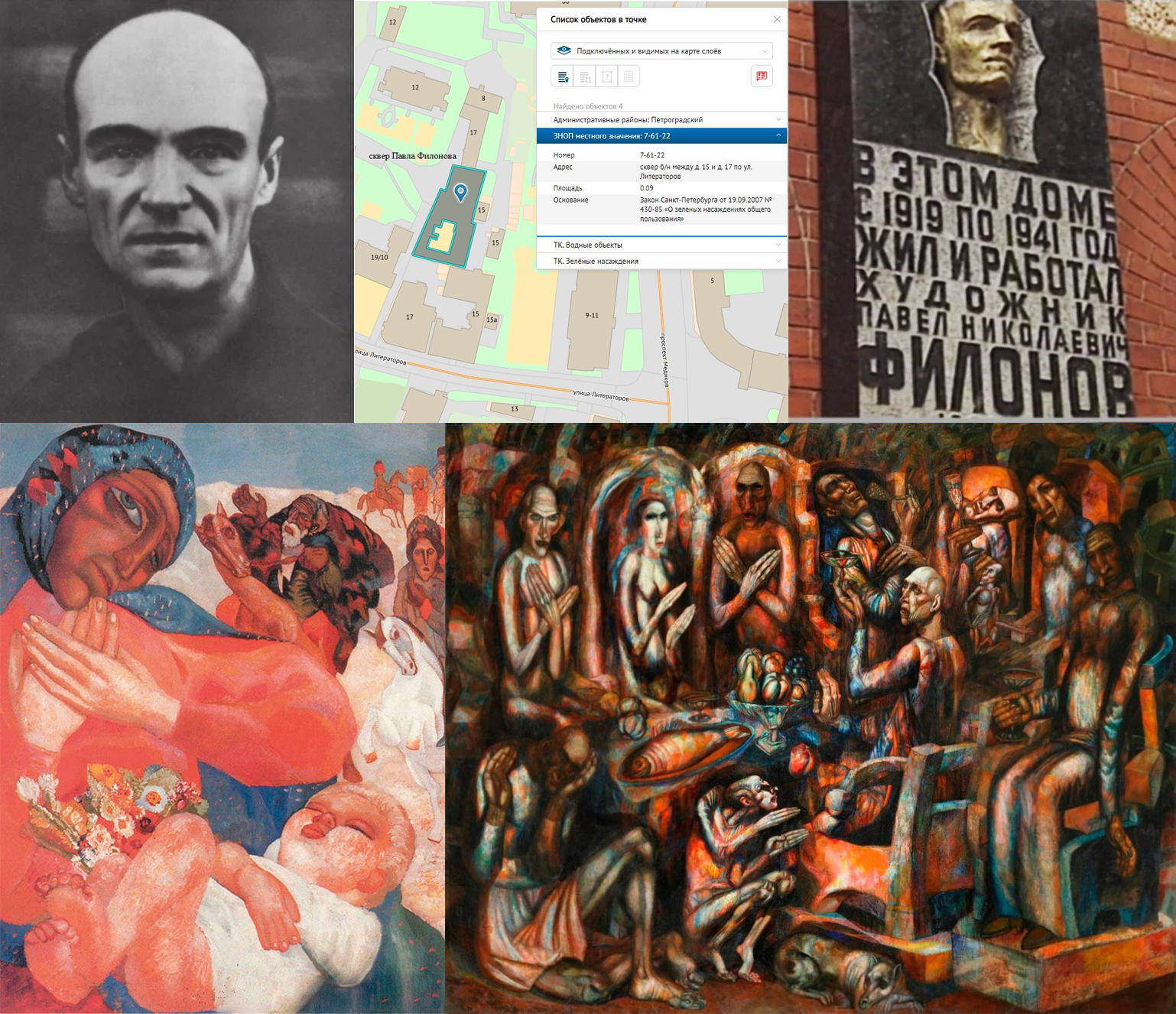 Павел Николаевич Филонов (1883-1941) - выдающийся художник и теоретик искусства, один из лидеров русского авангарда. Родился в Москве, с 1897 г. жил в Санкт-Петербурге, с 1919 г. и до конца жизни – в доме № 19/10 по улице Литераторов, рядом с которым и находится сквер его имени. Выходец из крестьянской семьи, в юности Филонов зарабатывал на жизнь малярными работами и росписями на заказ. В Академию художеств он поступил в 1908 г. после нескольких неудачных попыток из-за недостатка базовой подготовки. Но уже через два года окончательно отошел от академизма, покинул