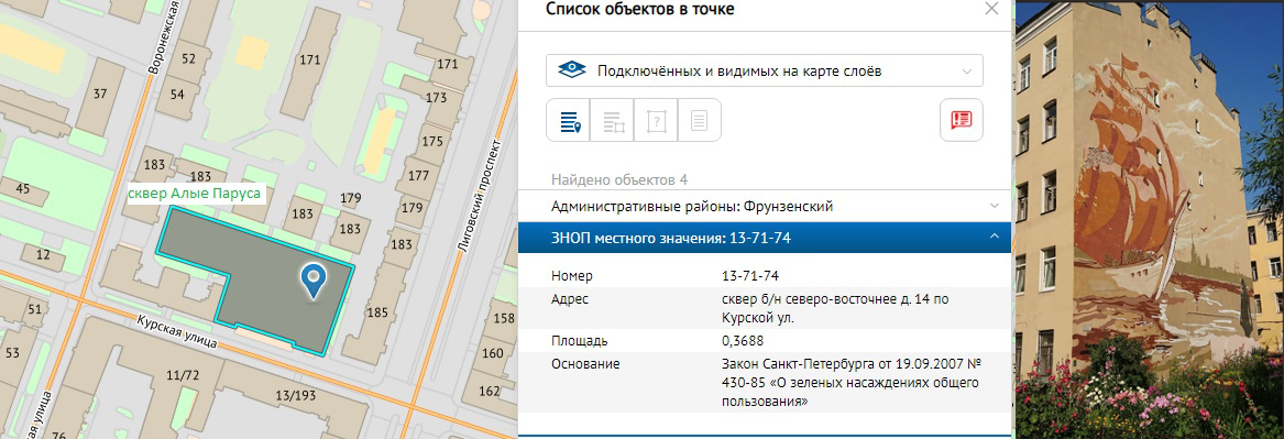 сквер Алые Паруса, наименованный в северной части Фрунзенского района, напоминает о знаменитой феерии Александра Грина и о прекрасной петербургской традиции праздника выпускников. Он назван так по просьбе местных жителей, поскольку брандмауэр соседнего со сквером дома № 183, литера Б, по Лиговскому проспекту украшает художественная композиция на тему "Алые паруса".