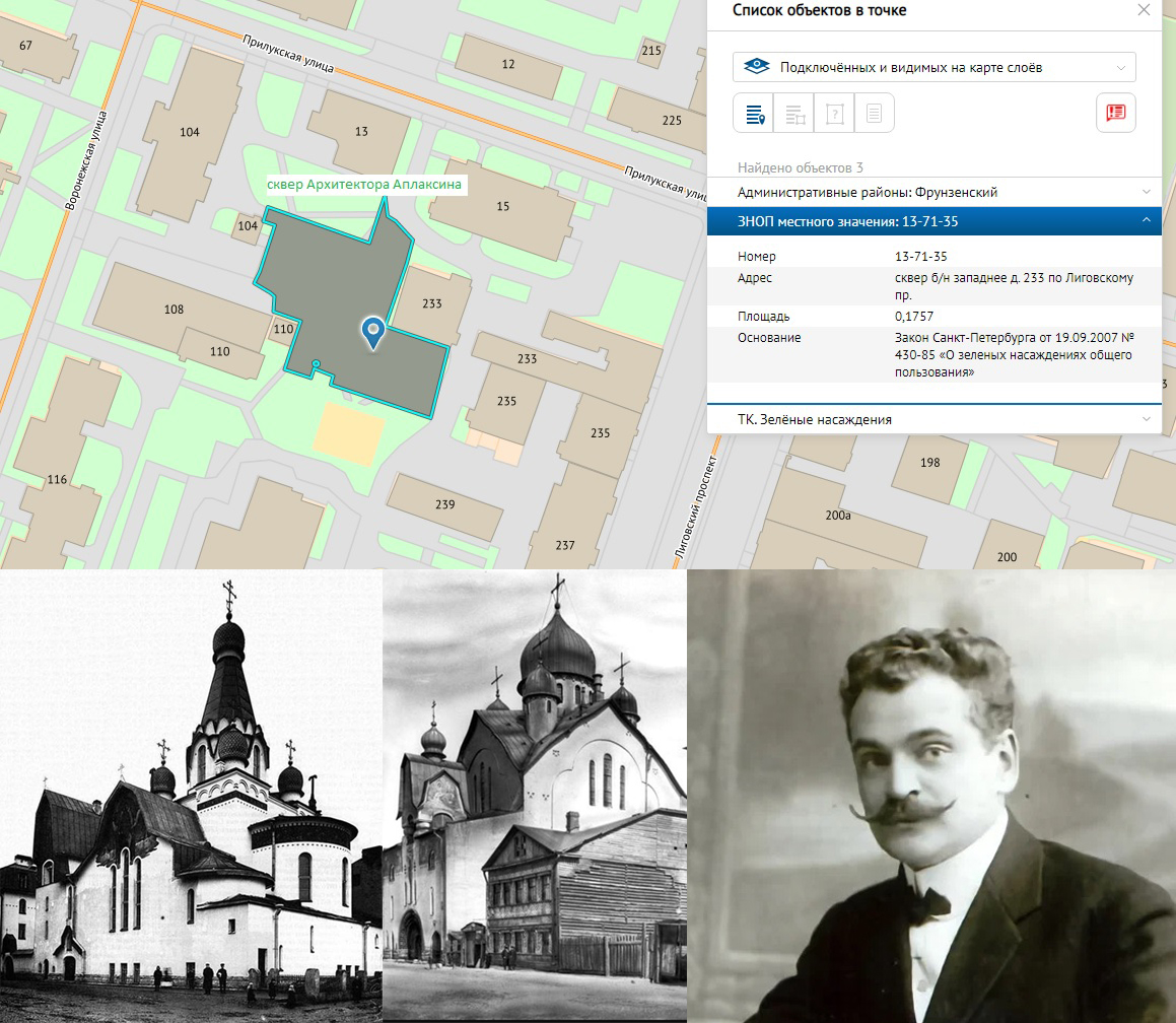 Сквер, находящийся в глубине квартала у дома № 233 по Лиговскому проспекту, получил название сквер Архитектора Аплаксина. Оно дано в честь самобытного петербургского зодчего Андрея Петровича Аплаксина (1879-1931), епархиального архитектора Санкт-Петербургской епархии в 1906-1914 гг.