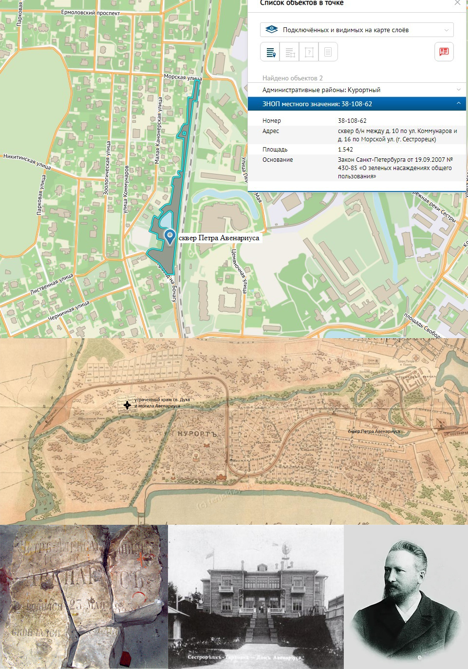 Новые названия скверов появились и в Сестрорецке. Сквер между домом № 10 по улице Коммунаров и домом № 16 по Морской улице, недалеко от сестрорецкого вокзала, стал сквером Петра Авенариуса, в память о создателе Сестрорецкой ж.д. линии и Сестрорецкого Курорта.