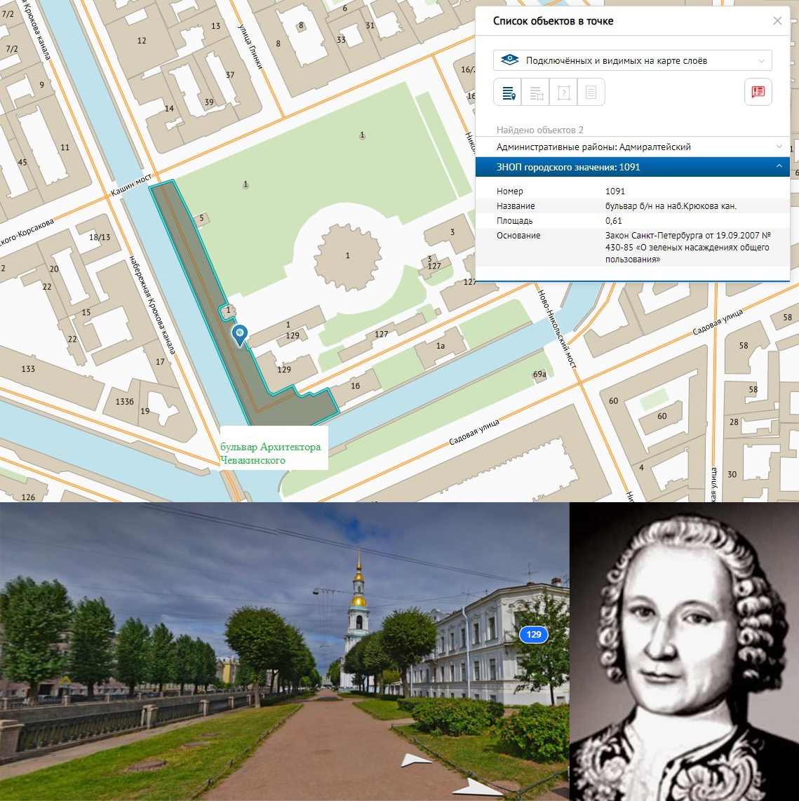 В названии бульвара Архитектора Чевакинского, который проходит по восточной набережной Крюкова канала у Никольского Морского собора, увековечено имя создателя этого храма, выдающегося зодчего XVIII в. Саввы Ивановича Чевакинского, работавшего в стиле елизаветинского барокко. Родился он в селе Вешки Тверской губернии, творческую деятельность начал в 1739 г. Чевакинский занимал должность главного архитектора Адмиралтейств-коллегии в 1741-1767 гг., работал над комплексом Новой Голландии, в 1745-1760 гг. был архитектором в Царском Селе. В Санкт-Петербурге он проживал в доме собственной постройки (Галерная ул., 58, перестроен).