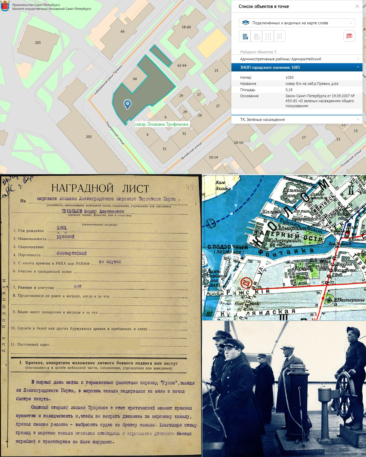 сквер Лоцмана Трофимова, который находится на пересечении Лоцманской улицы и набережной реки Пряжки, назван в честь Фёдора Алексеевича Трофимова (1891-1961), уроженца деревни Черная Лахта Петергофского уезда, который начал свою лоцманскую службу еще в Петрограде, в 1914 г. В период советско-финляндской войны 1939-1940 гг. Фёдор Трофимов участвовал в проводках боевых кораблей на Балтике. 22 июня 1941 года, в первый день Великой Отечественной войны, старший лоцман Ленинградского торгового порта Трофимов спас Морской канал от блокирования подорвавшимся на мине пароходом, за что был награжден медалью "За боевые заслуги". До выхода на пенсию он трудился лоцманом и проживал на Лоцманском острове (он же Подзорный), который находился в устье Фонтанки, а ныне слился с Безымянным островом. Лоцманская слобода, которой обязаны своим названием и остров, и улица, находилась в этих местах с XVIII века.
