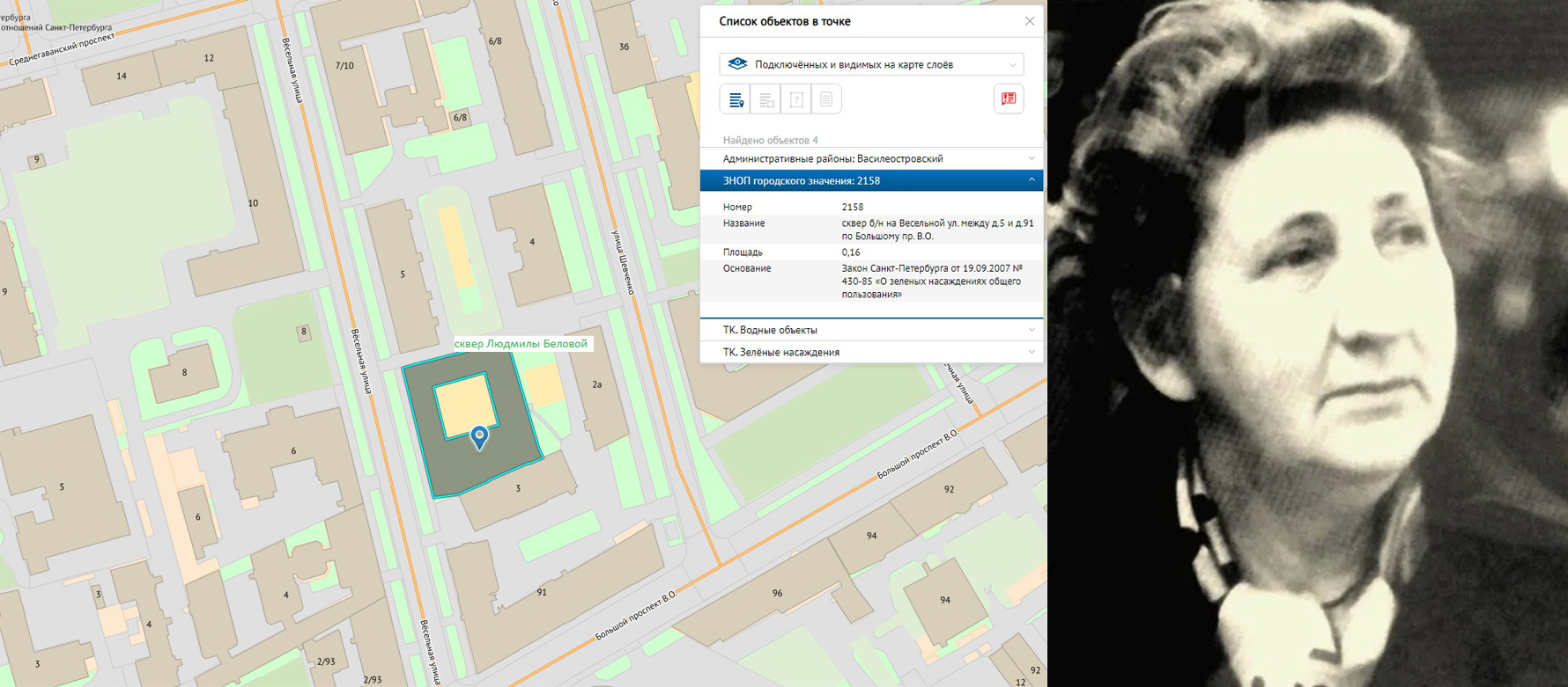 Буквально через дорогу от сквера Генерала Броневицкого появился сквер Людмилы Беловой, который находится южнее дома № 5 по Вёсельной улице. Он обрел имя в честь Людмилы Николаевны Беловой (1924-1993), многолетнего директора Государственного музея истории Ленинграда в 1954-1987 гг., проживавшей на Вёсельной улице в соседнем доме № 10.