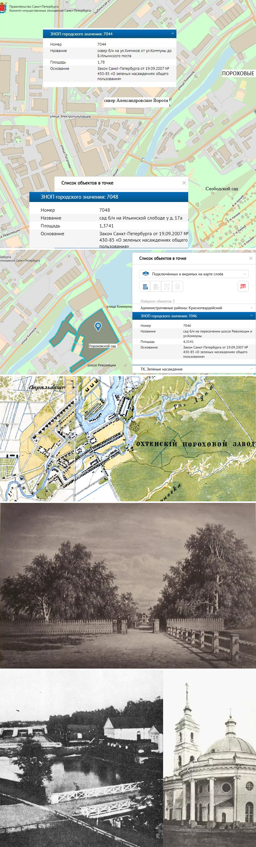 Сразу три зеленых объекта получили названия на Пороховых. Эта местность ведет свое название от Охтинского порохового завода, основанного в 1715 г. на реках Охте и Лубье, одного из старейших промышленных предприятий Петербурга. С ним связано также название Пороховского кладбища и Большой Пороховской улицы, а современное шоссе Революции до 1922 г. называлось Пороховское шоссе. В 1922 г. завод перешел на выпуск химической продукции, в 1927 г. превратился в Охтинский химический завод (впоследствии – комбинат). Его наследник, завод «Пластполимер» (ныне закрыт) до недавнего времени располагался по адресу ул. Коммуны, д. 67, на исторической территории порохового завода.