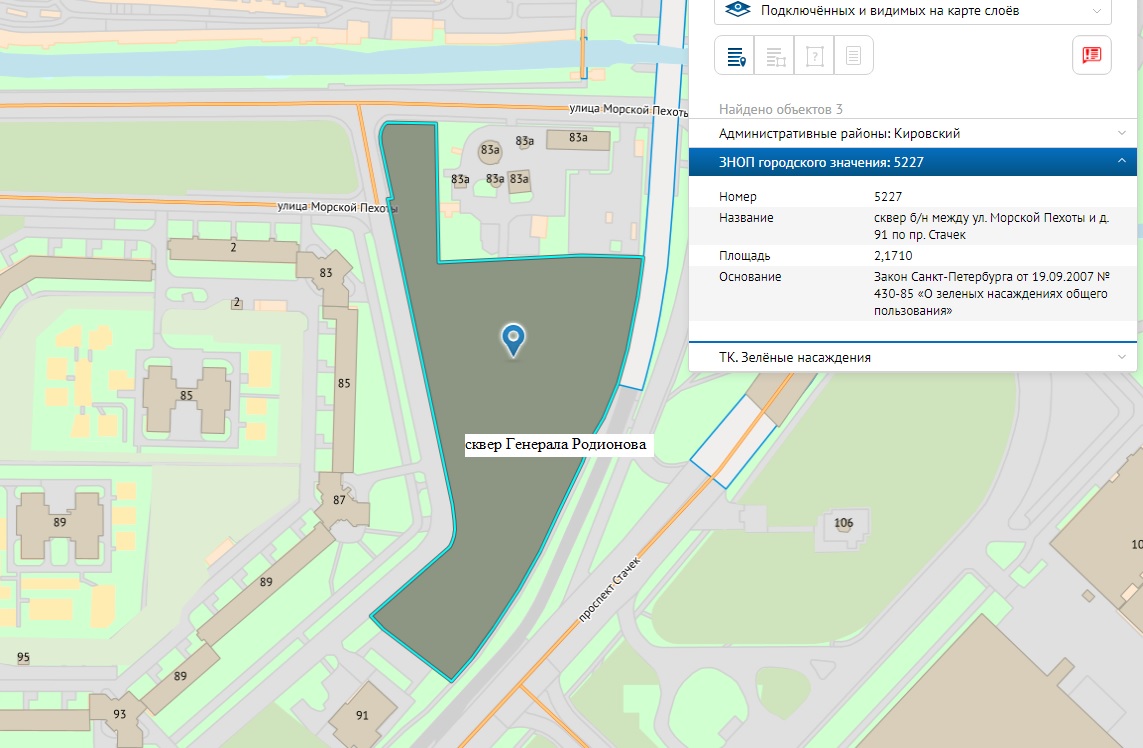 Постановлением Правительства Санкт-Петербурга от 30 декабря 2025 года безымянному скверу между улицей Морской Пехоты и домом № 91 по проспекту Стачек (ИН 5227) в Кировском районе Санкт‑Петербурга присвоено наименование сквер Генерала Родионова.